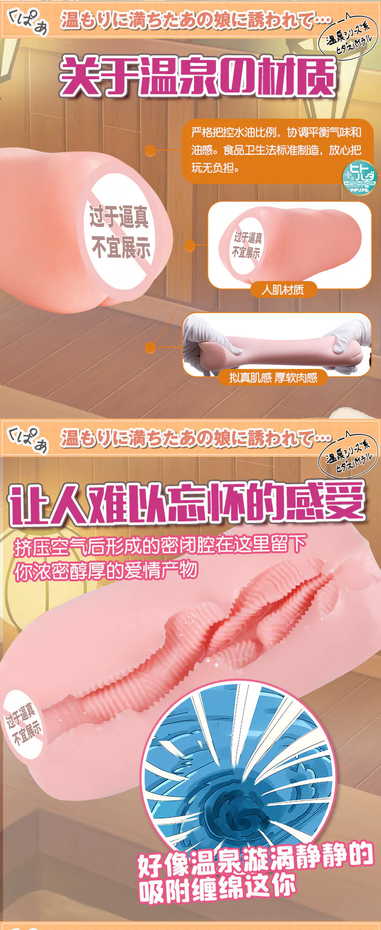 温泉欲情2的通道设计如钻头般螺旋交织,四条凸起触手全程环绕,层层递进,深入即锁紧,带来超越想象的搅拌式刺激!